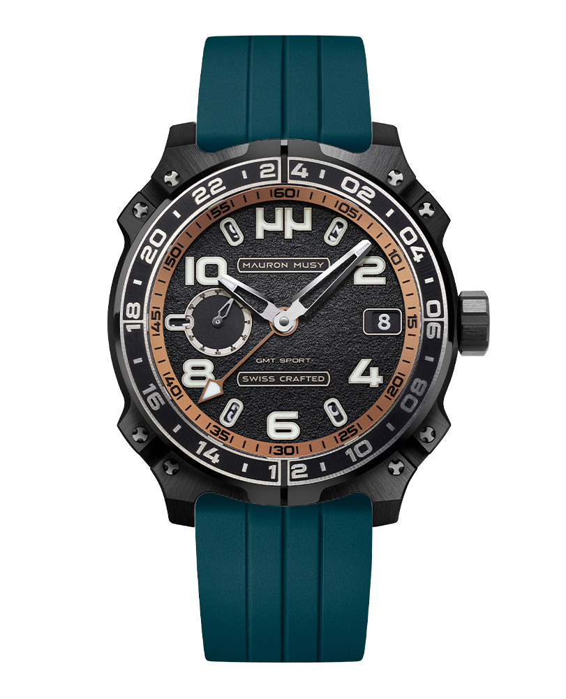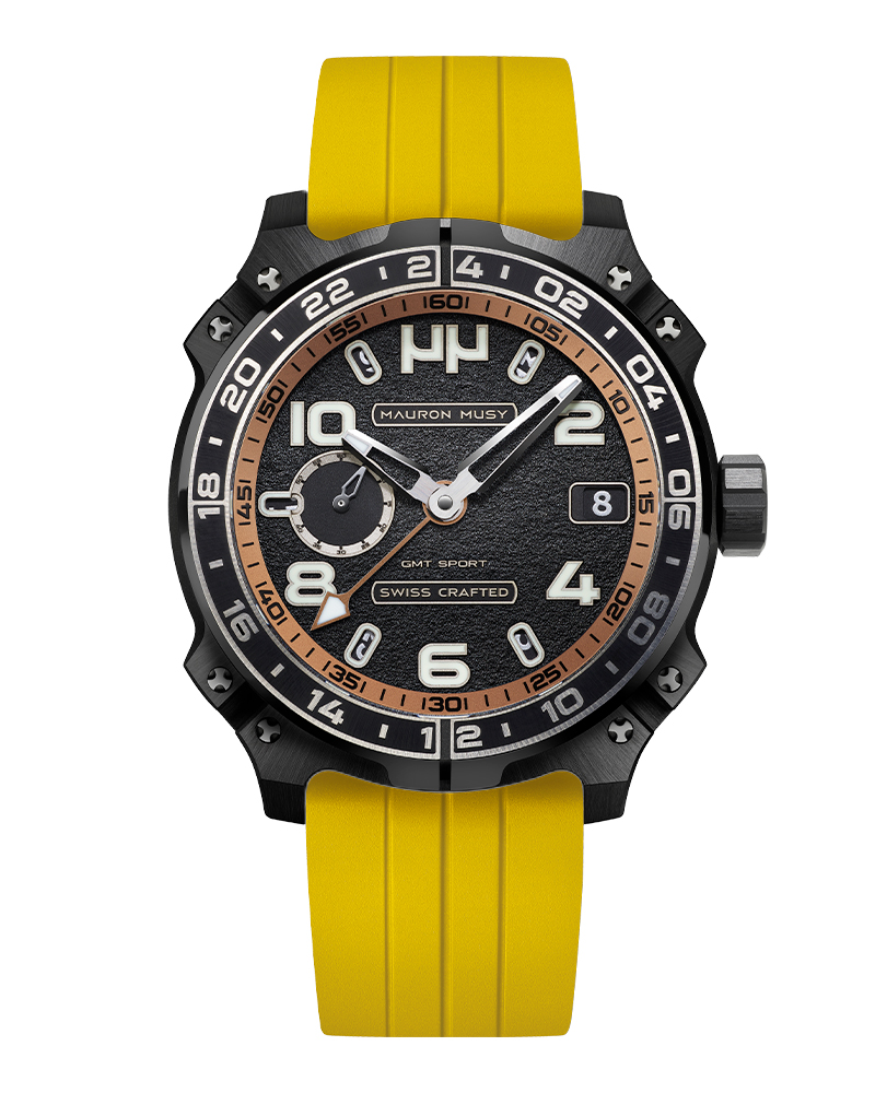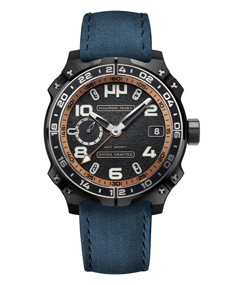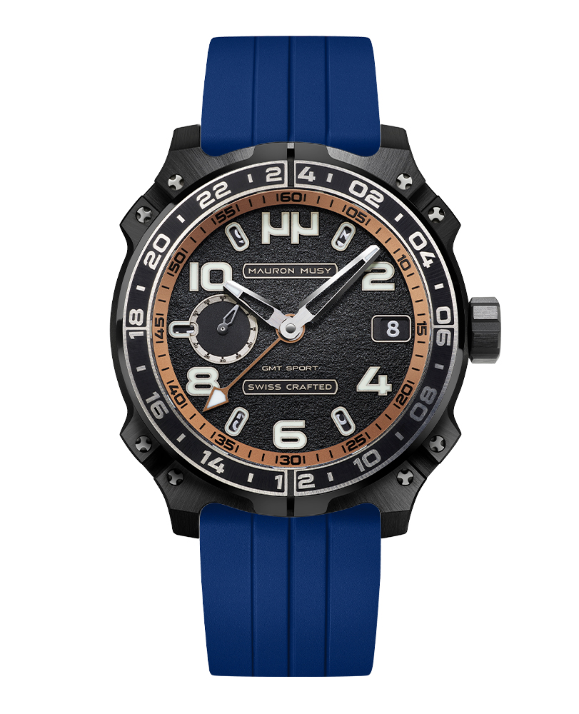 Le nouveau garde-temps GMT SPORT créé par MAURON MUSY entraîne la collection ARMURE vers de nouveaux univers: Sport & Voyage. Ce nouveau modèle, certifié « SWISS CRAFTED » et fortement inspiré des voitures de compétitions, est équipé d’un second fuseau horaire de 24h gravé sur une lunette titane-céramique.